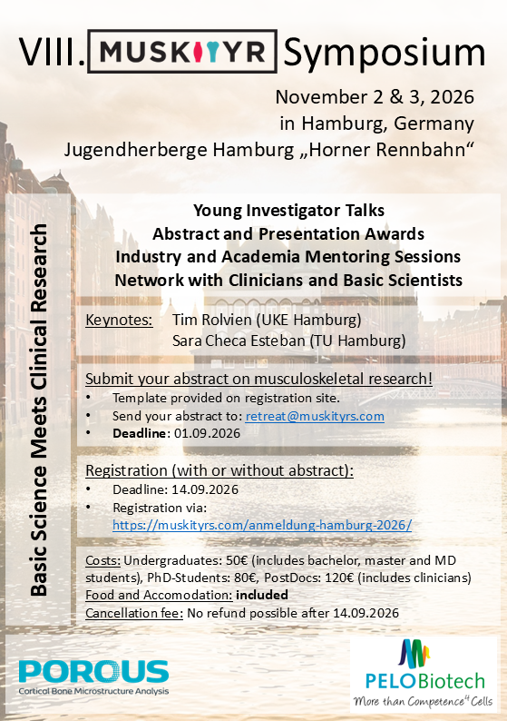 Seid dabei beim VIII. MuSkITYR-Symposium am 2. und 3. November in Hamburg. Wir freuen uns, unsere Keynote Speaker Tim Rolvien und Sara Checa begrüßen zu dürfen, die klinische und ingenieurwissenschaftliche Perspektiven einbringen werden. Wie immer bietet das Symposium mehr als nur Vorträge: Unsere Mentoring-Sessions bieten Raum für offene Gespräche über Karrierewege, wissenschaftliches Schreiben und das Leben in der Wissenschaft und darüber hinaus. Abstracts sind sehr willkommen, aber eine Teilnahme ist auch ohne Abstract möglich. Einsendeschluss für Abstracts ist der 1. September, Anmeldeschluss der 14. September. Die Anmeldung beinhaltet die Übernachtung in der Jugendherberge Hamburg sowie Mittag- und Abendessen, sodass ihr euch ganz auf Wissenschaft und Networking konzentrieren könnt. Hier gehts zur Anmeldung!